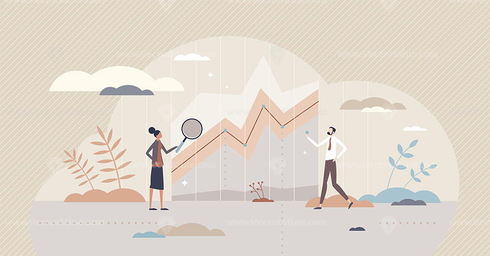 Description: Data visualization and report presentation or explanation tiny person concept. Display of information with statistics, forecasting or financial graph vector illustration. Economical development chart.
